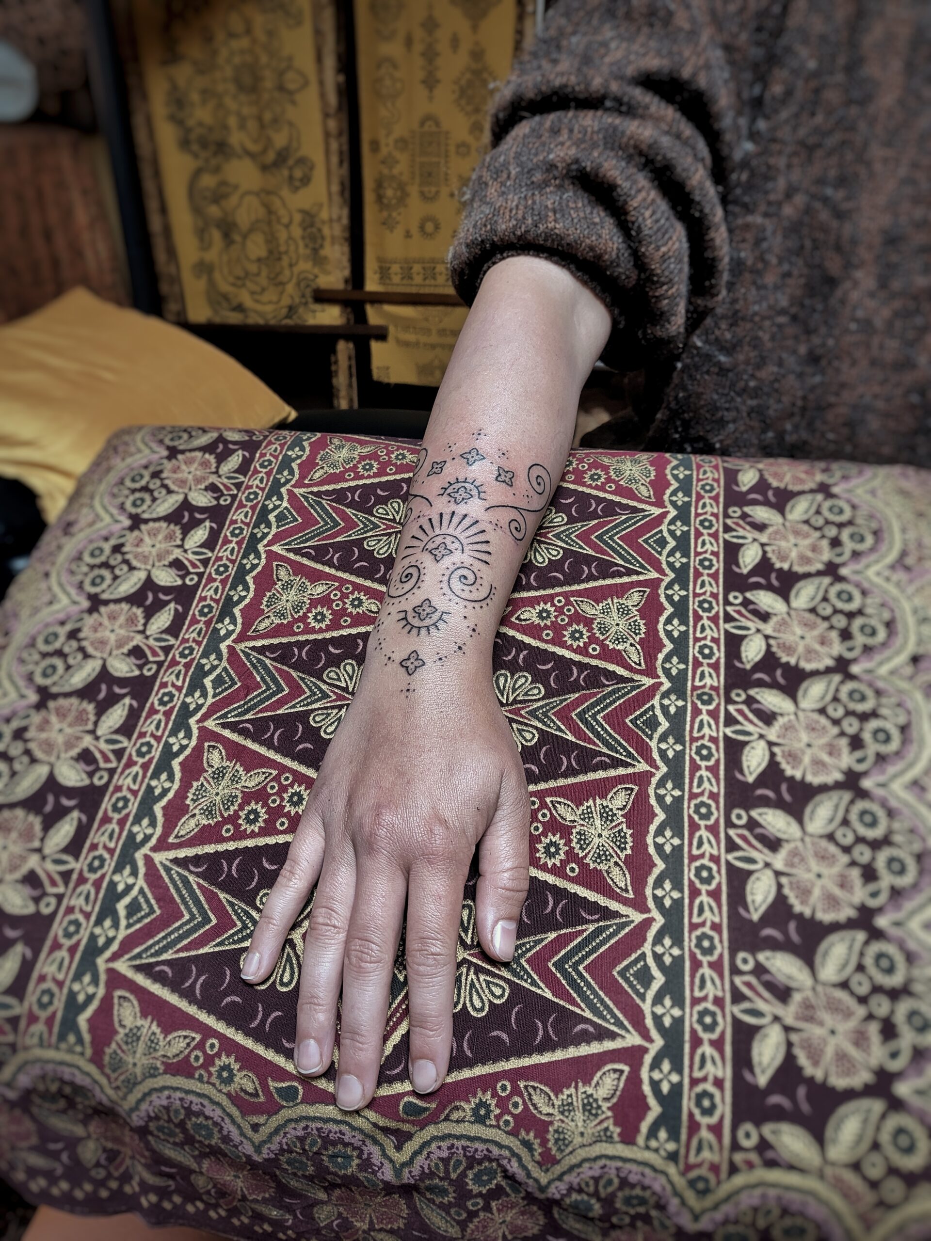 Een tattoo werd van oorsprong gezien als een markering om kracht bij te zetten in een wens, een proces of het bereiken van een doel. Dat is ook de intentie waarmee Fleur tatoeëert. Een tattoo bestaat uit symbolen die weer een uiting kunnen zijn voor een bepaald thema. Door in te tunen op mijn energieveld voelt ze aan wat ik met mijn tattoo mag ontvangen. Niet alleen voor nú in dit moment, maar voor de rest van mijn leven. Dat is wat de tattoo zo bijzonder maakt. Ondanks dat een tattoo iets vaststaand lijkt, zal de betekenis wellicht andere vormen aannemen of misschien pas over een hele lange tijd helder worden. Zo blijft een tattoo altijd voortleven en meegroeien met wie je bent. ⭐️